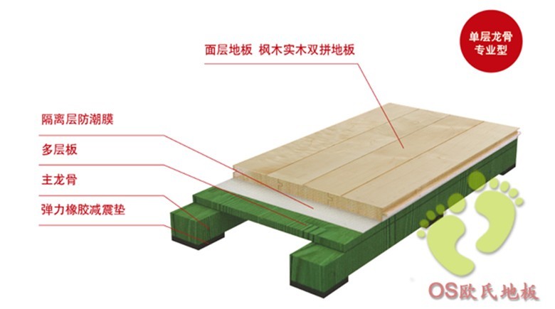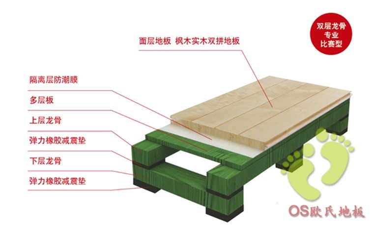 雙層龍骨結(jié)構(gòu)是體育木地板中一種懸浮式木地板結(jié)構(gòu),它不但堅固耐用而且彈性十足,運動性能完全滿足DIN標準的要求。提供出色的彈性而且具備有效的減震功能,地板結(jié)構(gòu)性能比較均勻,滿足用戶對地板各項性能、外觀和耐久性的要求,該系統(tǒng)擁有**的振動吸收,具有空前絕佳的運動性能,符合所有訓(xùn)練或者體育比賽的要求。