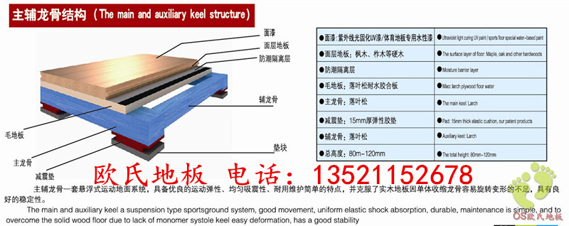 3、主副龍骨結構:此結構的體育木地板,主龍骨和副龍骨相互銜接保證了體育地板整個結構的穩固性,再加上提升高度的標準,使其達到一個標準的運動效果,主要用于單位職工活動室,網球室,羽毛球室,或專業要求不是很高的籃球館。例如:小學、中學籃球館等。